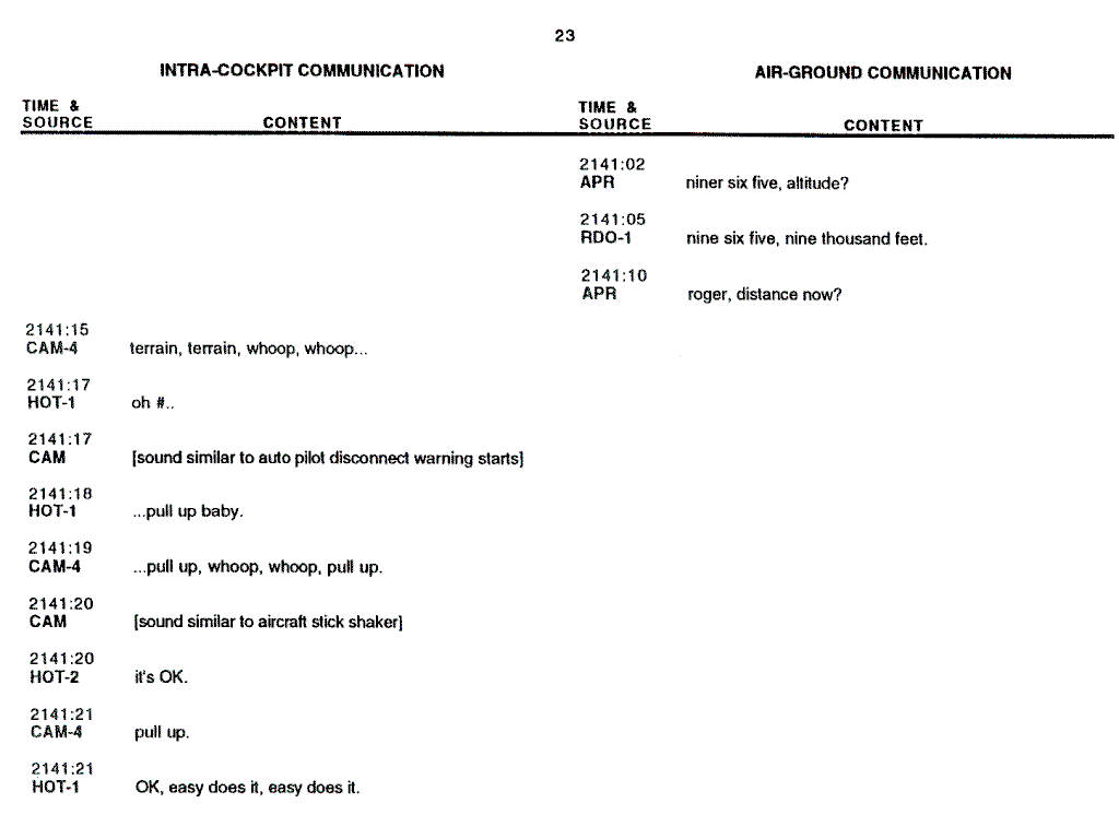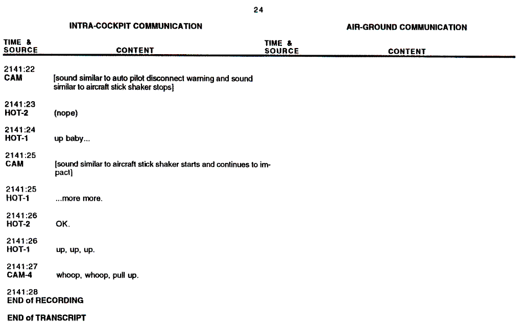 There are 24 pages of CVR readout (Appendix B), 2 Approach charts (Appendix C), 1 Operating Manual page (Appendix D), 2 photographs of the wreckage (Appendix E), and 5 pages of FMC readout (Appendix F).