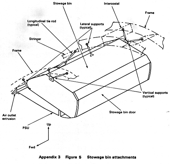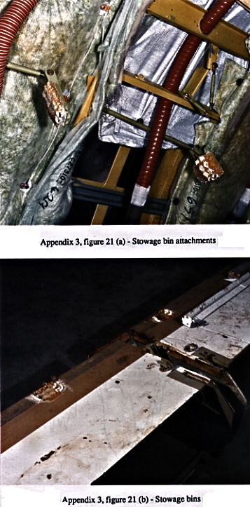 | 50. | Although the overhead stowage bins met the appropriate Airworthiness Requirements for static loading, all but one of the 30 bins fell from their attachments, which did not withstand the dynamic loading conditions in this accident. |