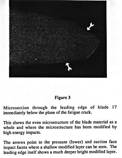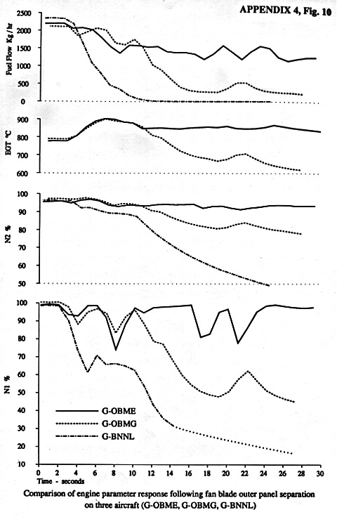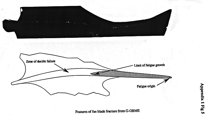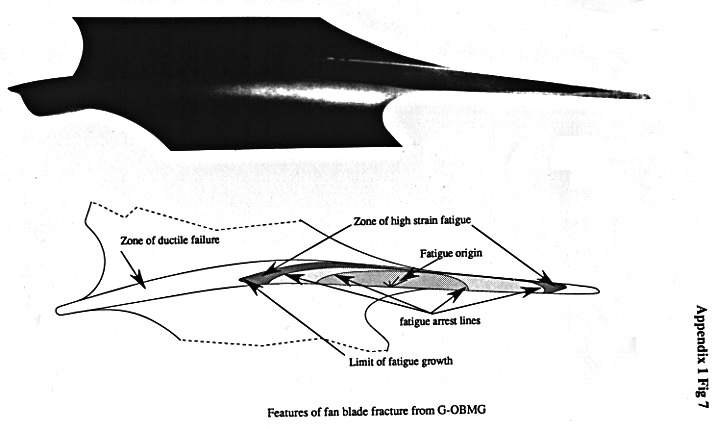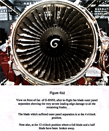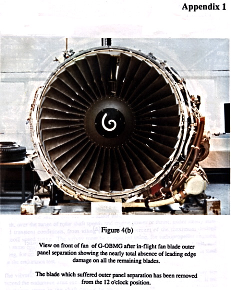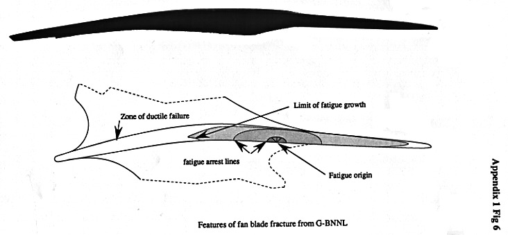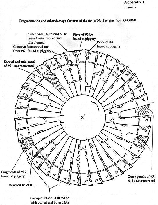 | 24. | Fifty three seconds before ground impact, the No.1 engine abruptly lost thrust as a result of extensive secondary fan damage. This was accompanied by compressor stalling, heavy buffeting and the emission of pulsating flames. This damage was probably initiated by fan ingestion of the blade section released by the initial failure, which was considered to have partially penetrated, and temporarily lodged within, the acoustic lining panels of the intake casing before having been shaken-free during the period of high vibration following the increase in power on the final approach to land. Sections of fan blades were found below this point of the final approach, including two small fragments which were determined to be remnants of the blade section which detached initially. |
