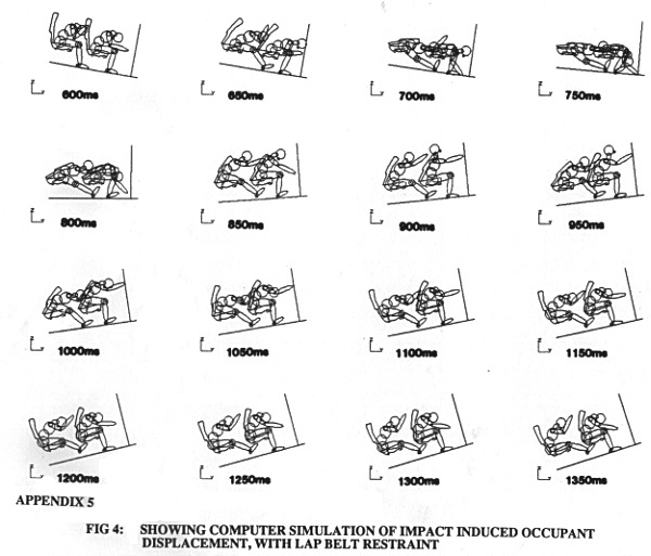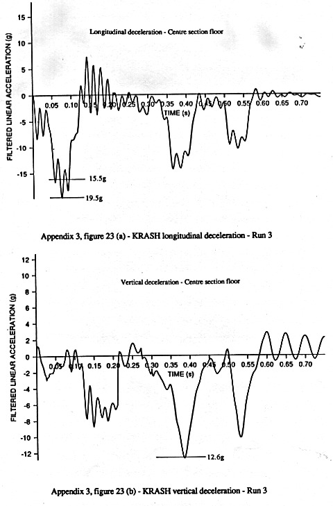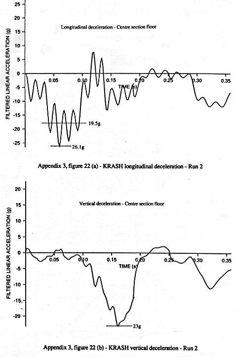 | 40. | The second and major impact occurred at a speed of between 80 and 100 knots, at an angle of approximately 16° below the horizontal and with the aircraft at a pitch attitude of between 9° and 14° nose down. The associated peak deceleration was of the order of 22 to 28g, predominantly longitudinal. |