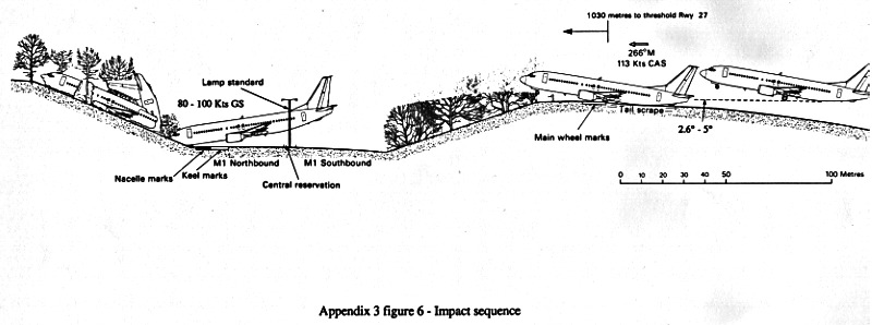 The initial ground impact was in a nose-high attitude on level ground just to the east of the M1 motorway. The aircraft then passed through trees and suffered its second and major impact 70 metres to the west and 10 metres lower, on the western (ie northbound) carriageway of the M1 motorway and the lower part of the western embankment. The fuselage was extensively disrupted, and the aircraft came to rest entirely on the wooded western embankment, approximately 900 metres from the threshold of runway 27, and displaced 50 metres to the north of the extended runway centreline.