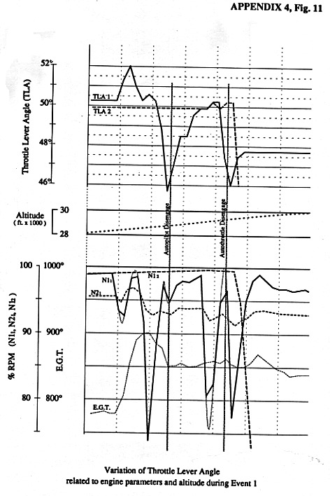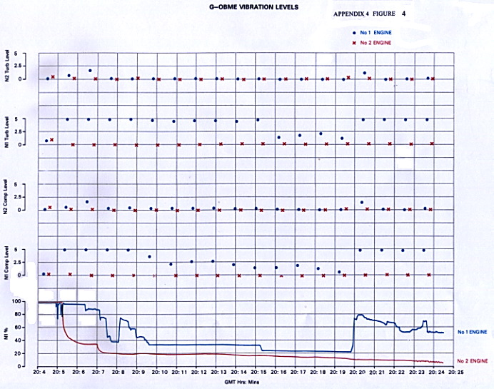 | 21. | About 3 seconds after the autothrottle was disengaged, and whilst the No 2 engine was running down, the No 1 engine began to stabilise. However, its indicated vibration remained at maximum for at least 3 minutes until this engine was throttled back for the descent. |