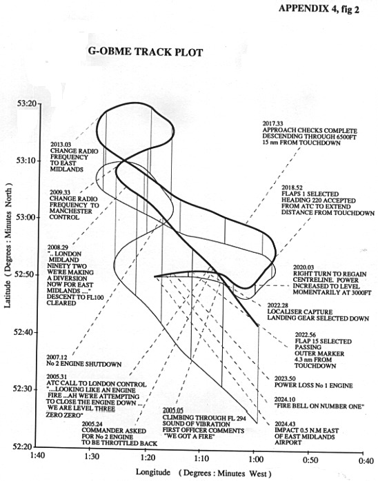 | 10. | Flight crew workload during the descent remained high as they informed their company at EMA of their problem and intentions, responded to ATC height and heading instructions, obtained weather information for EMA and the first officer attempted to re-programme the flight management system to display the landing pattern for EMA. Some 71/2 minutes after the initial problem, the commander attempted to review the initial engine symptoms, but this was cut short by further ATC heading and descent information and instructions to change to the EMA ATC radio frequency. |