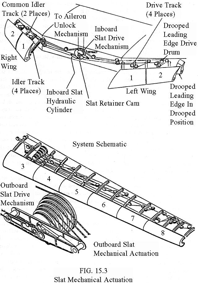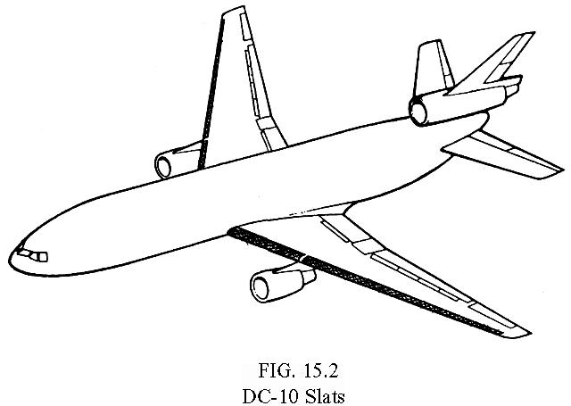 During takeoff, as with any normal takeoff, the leading edge slats were extended to provide increased aerodynamic lift on the wings [see fig. 16.3]. @en the slats are extended and the control valve is pulled, hydraulic fluid is trapped in the actuating cylinder and operating lines. The incompressibility of this fluid reacts against any external air loads and holds the slats extended. This is the only lock provided by the design. Thus, when the lines were severed and the trapped hydraulic fluid was lost, air loads forced the left outboard slats to retract. While other failures were not critical, the uncommanded movement of these leading edge slats had a profound effect on the aerodynamic performance and controllability of the aircraft. With the left outboard slats retracted and all others extended, the lift of the left wing was reduced and the airspeed at which that wing would stall was increased. The simulator tests showed that even with the loss of the number two and number four spoilers, sufficient lateral control was available from the ailerons and other spoilers to offset the asymmetric lift caused by left slat retraction at air-speeds above that at which the wing would stall. However, the stall speed for the left wing increased to 159 KIAS [knots indicated airspeed].
