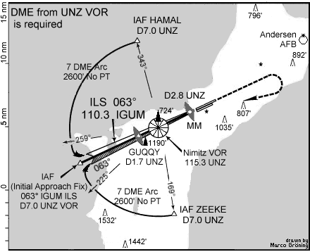 An aircraft approaching Agana is normally in radio contact with `Honolulu Center' (Honolulu ARTCC) on HF radio (which is over-the-horizon) and is `handed off' (relevant traffic control information concerning the flight is transmitted between controllers and the aircraft instructed to contact the new controller, who assumes traffic-control responsibility for the flight) to Guam Center about 250nm out, and Guam Center issues the approach clearance, according to Jean-Claude Rudaz, a professional pilot familiar with the route Seoul-Guam (Rud). The aircraft nearing Agana will be handed off to `Guam Approach', the Agana Center Radar Approach Control (Cerap), located at Andersen Air Force Base, about 10nm (nautical miles, 11.5 statute miles) away from the civil airport at Agana. The approach clearance consists of verbal instruction from Guam Center by radio that the aircraft is `Cleared for the XXX Approach', where XXX is one of the approved and published approaches. `Cleared for the ... approach' means that Air Traffic Control (ATC), whose responsibility it is under Instrument Flight Rules to ensure separation of that aircraft from other controlled traffic, authorises that aircraft to perform the XXX approach to the airport: