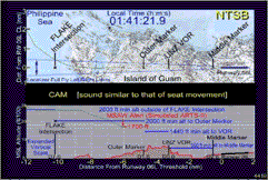 The animation depicts a top and side view of the topography of Guam for the flight path of the airplane within a 12 nm x 4 nm area, from 12 nm out from Runway 06L threshold for FL801 on approach to Agana A/P. The top view is to scale (in nautical miles) for both the x and y axes, and is oriented so that the x axis parallels the centerline of Runway 06L and the y axis is perpendicular to the runway centerline, with distances measured from left and right of the runway. The side view is displayed at an expanded vertical scale with each horizontal line representing 200 feet MSL altitude. The y axis is MSL altitude divided by 100, in feet. The x axis coincides with the x axis for the top view and is in nautical miles. An abbreviated-verbatim CVR transcript is displayed between the top and side views, with text appearing in groupings for readability and for as near as possible real time display. Time is displayed as local time in the top view.