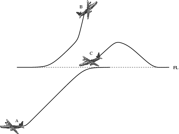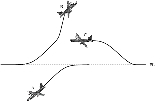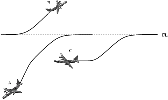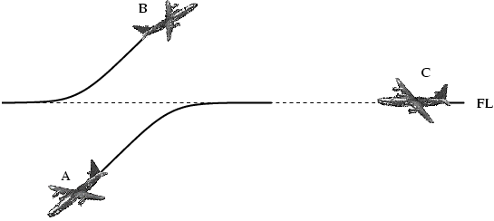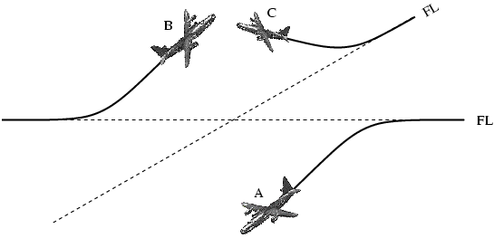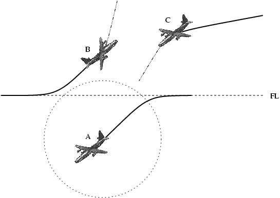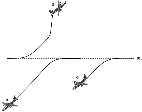 Aircraft C is at the same FL as Aircraft A and B, but they do not all reach alert threshold simultaneously. Suppose first that an RA is issued for Aircraft A and B. Suppose WLOG that Aircraft B climbs and Aircraft A descends. This situation is illustrated in Figure 8.