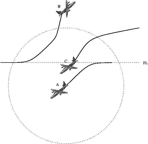 A subsequent conflict is generated between Aircraft B and C. When Aircraft C is level or moderately descending, this can be handled in the TCAS logic by issuing a "non-crossing" RA [22, Figure 9, p18]: the RA flattens the climb of Aircraft B and advises Aircraft C to arrest descent if descending, or to climb if level. It is clear qualitatively that if a non-crossing RA can be issued, the three aircraft attain the required vertical separation.