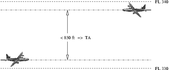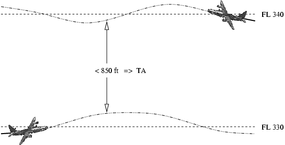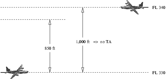 Second amongst those reasons is the proportion of "nuisance" advisories. An extensive discussion of nuisance advisories, primarily in European airspace, may be found in [20]. Two examples may be given here. Europe has implemented Reduced Vertical Separation Minima (RVSM) from 24 January 2002. RVSM provides Flight Levels every thousand feet for traffic from FL 290 to FL 410 inclusive [25]. RVSM has been in trials over North Atlantic airspace (NAT) since 27 March, 1997 [26]. The alert threshold for absolute vertical proximity in TCAS Version 6.04a is 1200 ft for TAs and 800 ft for RAs. Clearly, two aircraft passing each other at adjacent FLs in RVSM will generate a nuisance TA with Version 6.04a which does not lead to an RA [23, Section 5.2, pp22-3]. Not so well known is that this can also happen with TCAS Version 7 and its reduced absolute vertical proximity threshold of 850 ft for TAs and 70 ft for RAs [23, Section 5.3.4 Vertical Offset, pp24-5]. The ideal situation is illustrated in Figure 1. Two aircraft pass each other with 1,000 ft vertical separation, flying exactly level at the assigned flight level with no error.