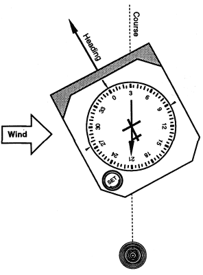But do you really head off at 345° from KSFO? What if there's a 30-knot (nautical-mile-per-hour) west wind blowing off the ocean? You're flying the Archer at 120kts. Flying an airplane is somewhat like boating, in that the aircraft rarely goes exactly in the direction in which it is pointing. If you want to get across the river to the other side directly opposite, you had better point the nose of the boat upstream into the current, else you will drift downstream and reach the other side downstream of where you wanted to land. In an aircraft, if the wind is blowing you from due west, and you wish to go due north, you had better point the nose of your aircraft to the left, into the wind, because the wind will be blowing you to the right, and if you point due north, you will end up way to the right of where you want to be. The direction in which you are pointing is called your heading. What's your heading in order to maintain an initial course of 345°? With this 30kt direct crosswind (wind coming at you perpendicularly like this), flying at 120kt and wishing you had believed that teacher in high school who told you that trigonometry was important, you had better fly at the angle whose tangent is (30/120), that is, a whopping 14° further left, or 331°. So all in all, you're flying 29° further left than what you might have first thought. (You're also going slower over the ground, since trigonometry and Pythagoras's theorem will tell you you're flying square-root(16+1)= 4.12nm through the air for every 4nm over the ground you fly. So your 120kts airspeed translates to 116.4kts over the ground. So instead of going due north by flying 345° at 120kts, you're going due north at 116.4kts by flying a heading of 331° on your compass.