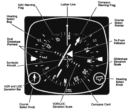 Finally, many aircraft (and most commercial transports) have an instrument that combines a directional gyroscope with a VOR receiver, called a Horizontal Situation Indicator (HSI) and which looks like this: