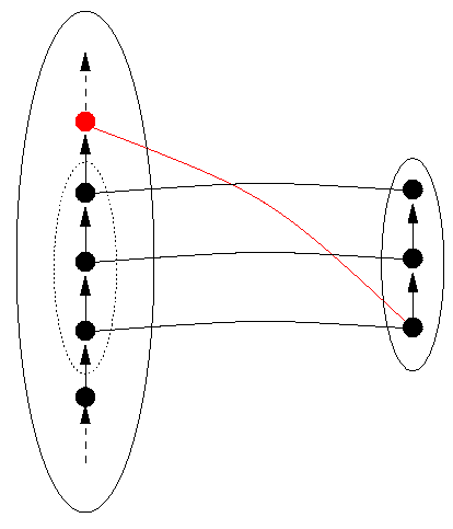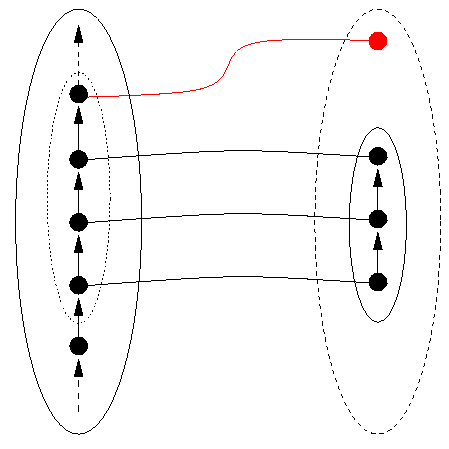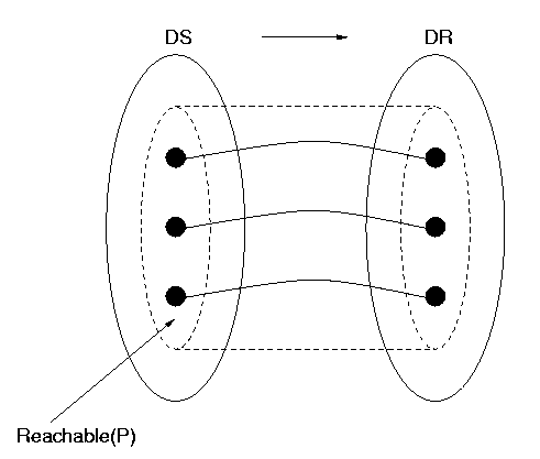 However, the condition that DRep be bijective on the reachable domain in DS does not suffice. DRep may be an operation which has wider meaning outside of the reachable domain of the particular program. Because of this, DRep must also be one-to-one on the part of DR that DRep maps the reachable domain into, which has the rather complicated name the image on Reachable(P) of DRep, denoted Image(Reachable(P)). The set Image(Reachable(P)) is shown in the figures as a dashed oval inside the oval representing DR. We illustrate in Figure 5, below, a situation in which DRep is one-to-one on the reachable domain, but not on the larger domain on which values of DRep may be calculated. For visual simplicity, we don't distinguish DR from Image(Reachable(P)) in Figure 5 and some subsequent figures, where we do not need to.