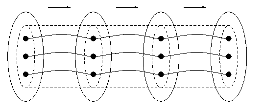 By rearranging the picture of the elements on the right-hand side (in the `range' of the function), one can always draw a bijection as in Figure 4. We use the notation "DS" for the data structure, on the left, and "DR" (Data Representation) for the domain in which the data is represented , on the right. Figure 4 also shows the function restricted to a particular part of DS, that inside the dotted line in the left-hand set, taking values inside a particular part of the representation, inside the dotted line in the right-hand set. We shall shortly talk about the significance of such restrictions for data representation.