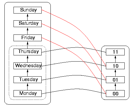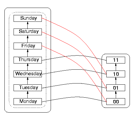 It is interesting to observe that the DS itself has wrap-around, namely that incrementing Sunday gives Monday in the normal scheme of things. But the DS wrap-around, which happens after 7 items, is out of sync with the DR wrap-around, which happens after four items rather than after seven. So Sunday rolls over to Monday in the DS on the left, but before that happens, the sequence 11 in DR representing Thursday `wraps around' to 00 again, so 00 appears to represent both Monday and Friday. Since 00 represents more than one date (as do the other sequences in fact, as a consequence of the wrap-around), the function is not one-to-one. The danger is that the reachable domain will have been imperfectly specified by the programmer or designer, so that a user could calculate with values outside the nominal reachable domain, without realising that heshe is doing so, and assuming everything is in order.