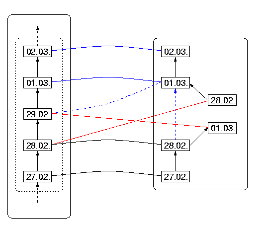 The leap-year structure violation is illustrated in Figure 15 (in which we have written DRep(02.28) also as 02.28 in DR, and other dates similarly, we hope without confusion ensuing). The structure-damaging connection between 02.29 on the DS side, and DRep(03.01) in DR is shown as a dashed blue line; respectively on the DS side as the successor of 02.28, and on the DR side as the increment of DRep(02.28). We have not included the year, because in principle this situation could occur for any leap year which has not been considered as such by the designers of the program.