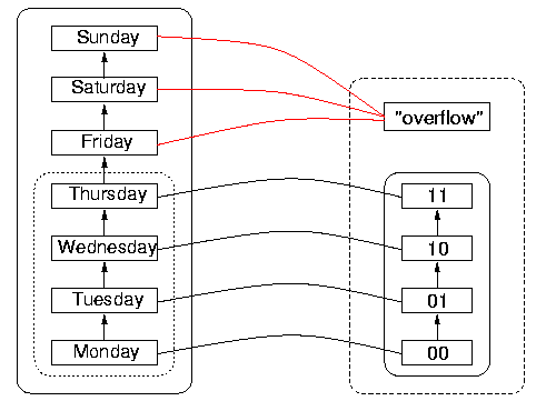 For an example of a function with wrap-around, consider the following attempt to represent days of the week in two bits. Bit sequences are ordered, as shown in the DR on the right of Figure 7, below. So are days of the week, as shown in DS to the left. If the order on the bit sequences in DR is enumerated using the hardware increment function, then the value of the increment function applied to the bit sequence 11 is actually 00. Wrap-around means that, although the order is correctly implemented on what is taken to be the reachable domain, namely Monday through Thursday, the order cannot be implemented by the increment function on the natural extension of the reachable domain (namely, including Friday through Sunday), because its value on 11, the largest bit sequence of the four, is the smallest sequence (although it does agree with the order on 00, 01, and 10, correctly giving the next largest sequence). This would mean to the program that the day following Thursday is Monday, which is incorrect. To the program, whatever the day following Thursday is, it is out of the reachable domain, and it certainly cannot be Monday, which is inside the reachable domain. This wrap-around phenomenon is called `rollover' when it happens with dates.