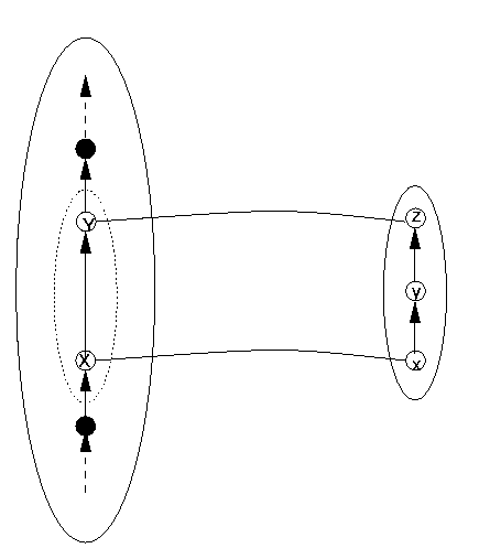 Because the function DRep is supposed to be one-to-one and total, there is equally damage if a similar situation happens in the other direction: DS has an element whose representation is skipped in DR. This situation is illustrated in Figure 14. There is, however, a slight difference which makes the situation not quite symmetrical. The DS item Y has no direct representation on the DR side, so in fact the function DRep is not total. Thus two problems arise in the case in Figure 14: structure damage and an intotal DRep. Figure 11 was drawn assuming DRep was total on the reachable domain, to illustrate structure damage alone. However, the line from Y to y (= DRep(Y)) in Figure 12 was drawn in blue to highlight the situation we describe in Figure 14, in which not only is structure not preserved, but DRep is not total.